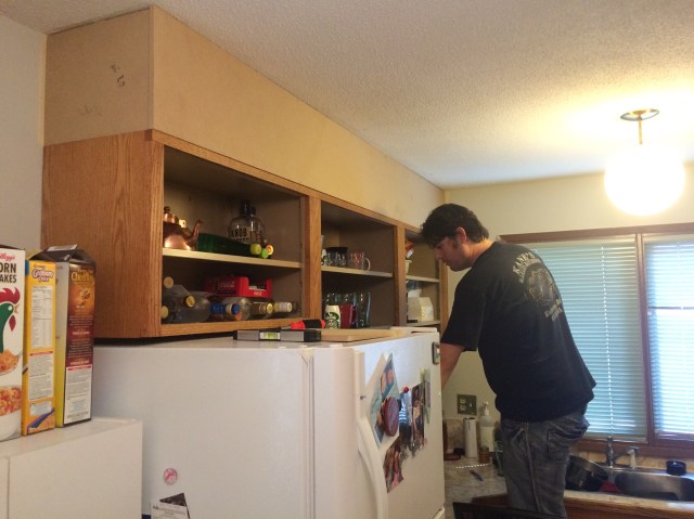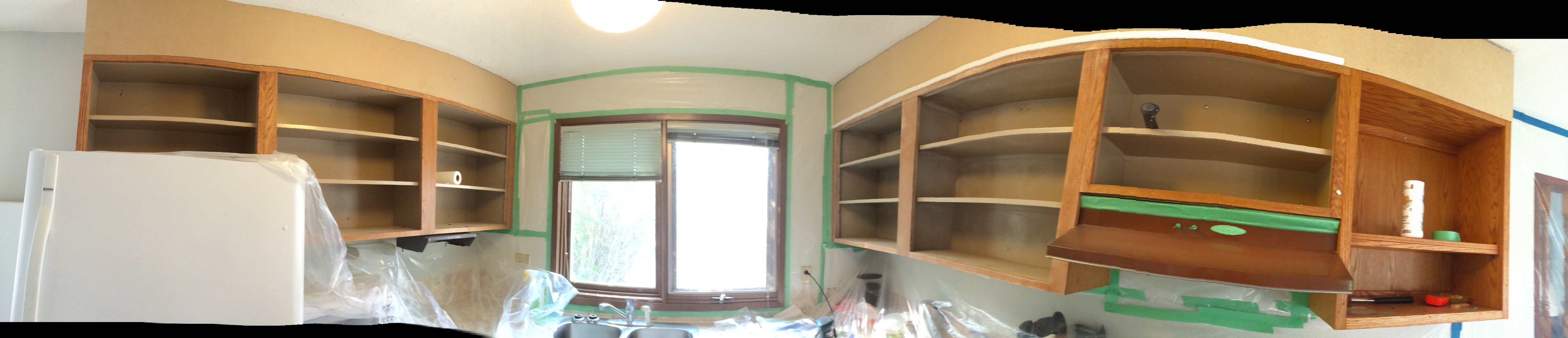 Once we had the MDF and the crown moulding up (it’s not up yet in the picture below, I forgot to take pictures), I emptied out all the cupboards and started taping off the kitchen.