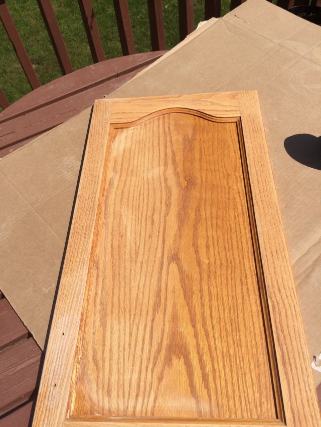 I started with scrubbing all of the door with hot soapy water to get all the grease and built-up crud off. This is an important step. Your cabinets are old and dirty. Scrub! With soapy water! Rinse well. Your water will get very dirty.