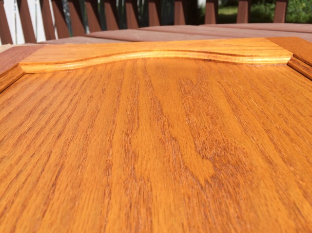 See the shine on the beveled edge? That’s what you are trying to get rid of (Really hard to get a picture of). Also, can see the white spots in the grain? That’s where my clear coat was coming off.