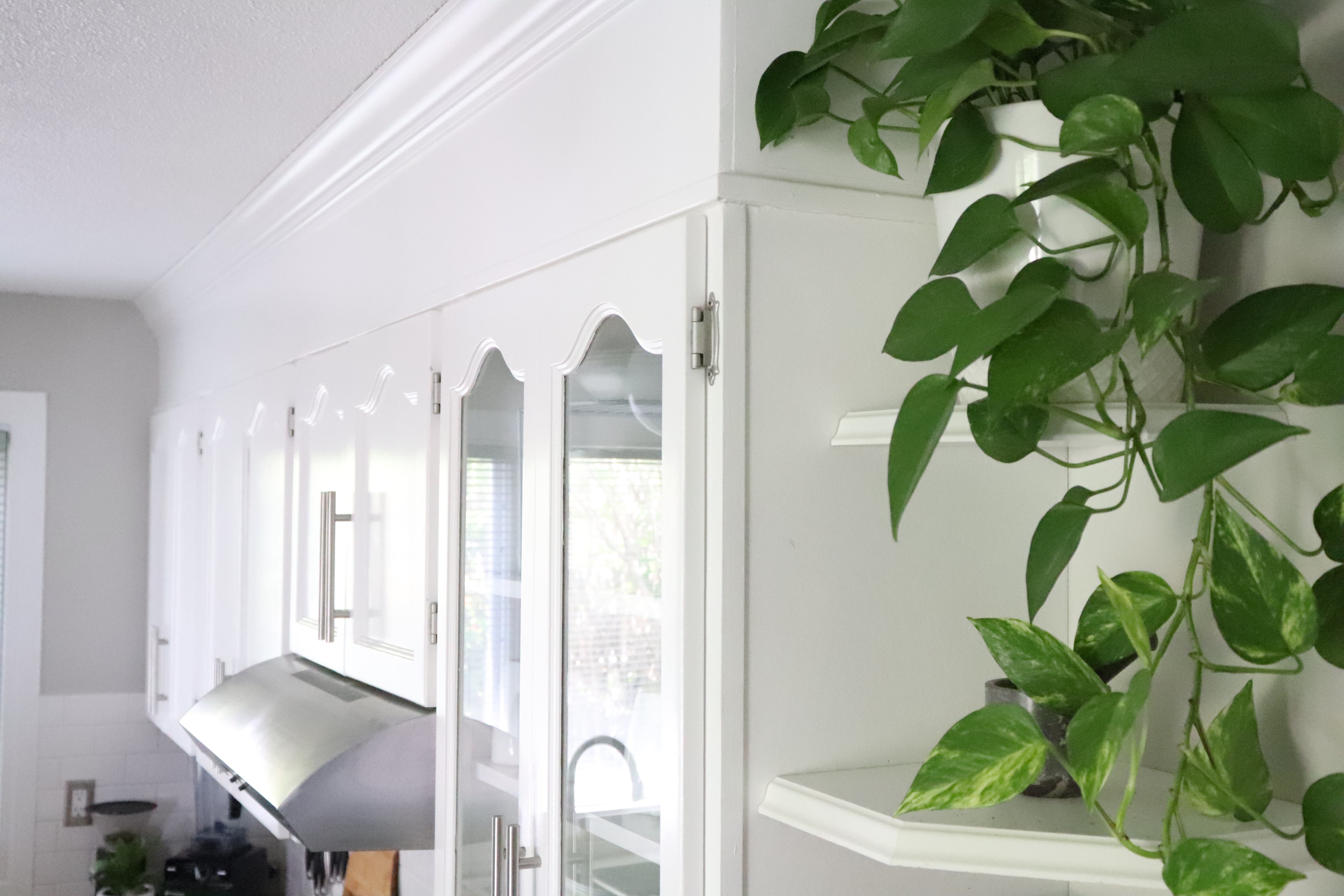 The crown molding and MDF fronts that we added on top of the existing, terrible 70/s plastic on top of the cabinet look so nice.  Before, that top was a dark, dark brown, and that made the ceiling feel lower.  Amazing what a little white paint will do to make your ceiling feel higher!